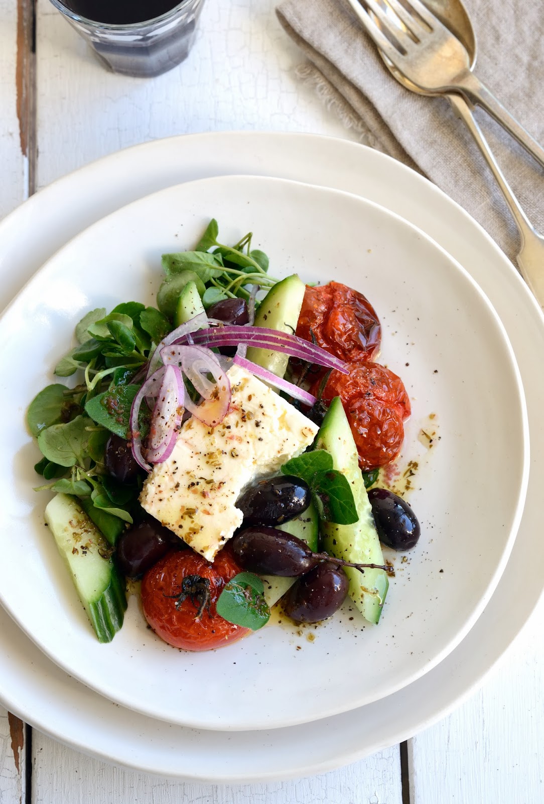 Preheat oven to 150ËšC (300ËšF) and combine oil, salt, pepper, sugar and balsamic vinegar in a small jug. Whisk to combine. Line an oven dish with baking paper and position tomatoes reasonably snugly into it. Pour oil mixture over tomatoes and cook for 50-60 minutes until slightly shrivelled and bursting with flavour. Put red onion slices in a cup of iced water for half an hour to crisp up and slightly reduce its sharpness. Halve cucumbers lengthwise and scoop out the seeds with the tip of a teaspoon. Slice into 3cm diagonals. Gently layer watercress, cucumber, tomatoes, feta (roughly crumbled into large chunks), onion, olive, mint and oregano onto a large platter. Shake dressing ingredients together in a small jar to combine. Pour over salad five minutes before serving and finish with a last good grinding of black pepper. Serves 6-8.
