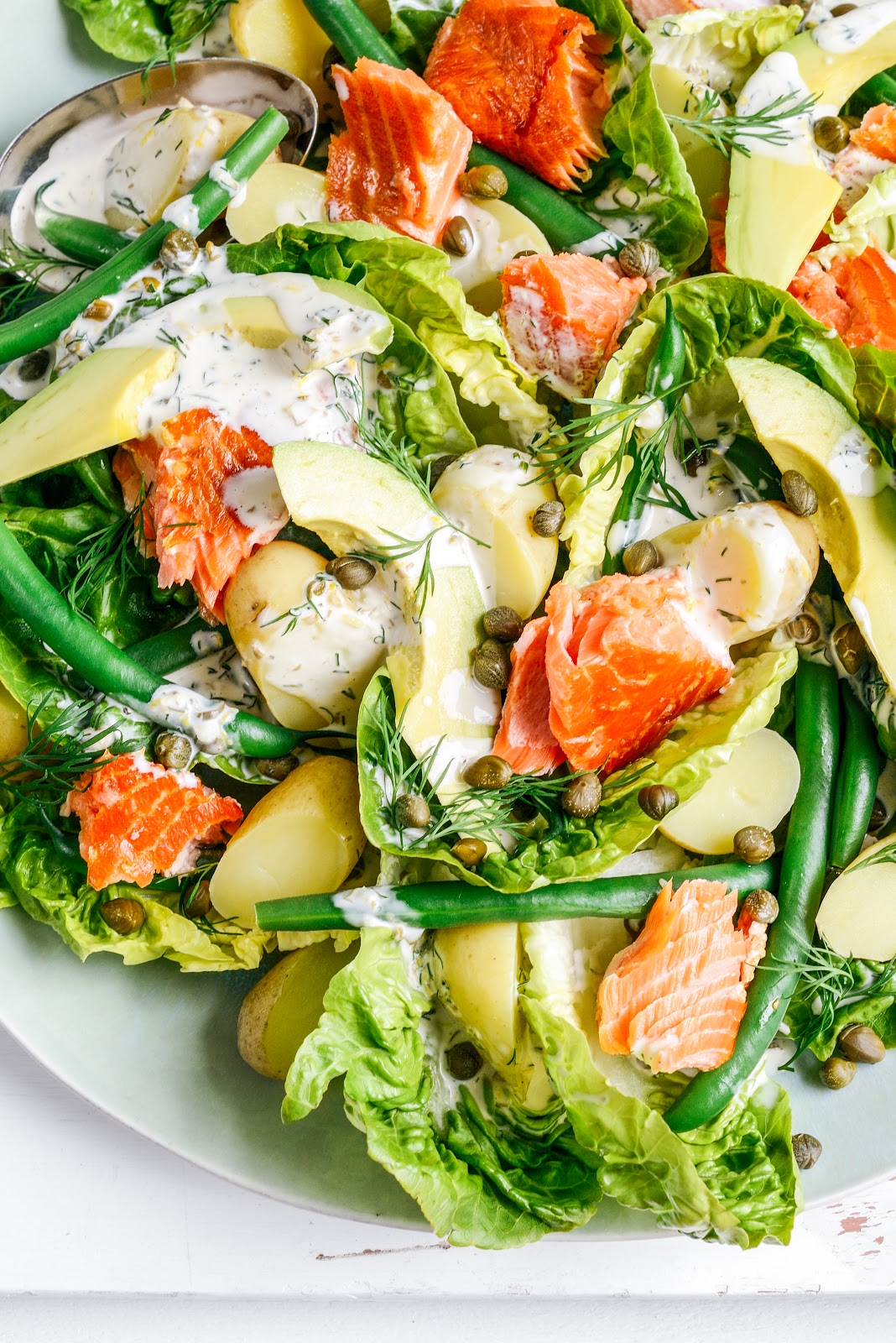 Bring a large pot of water to the boil, drop in potatoes and cook 15-20 minutes or until just cooked through. Drain and set aside to cool. Repeat process with beans, cooking for just 2 minutes, then drain under cold running water and set aside. In a small bowl mix half of the dill, half of the capers, mayonnaise, lemon juice, zest and garlic. Season to taste with salt and pepper and thin with 1-2 tablespoons water for easy drizzling. Layer lettuce, potatoes, beans, salmon and avocados onto a large serving platter. Pour over dressing and sprinkle with reserved dill and capers. Ta dah!!!! πŸ™‚ Serves 6