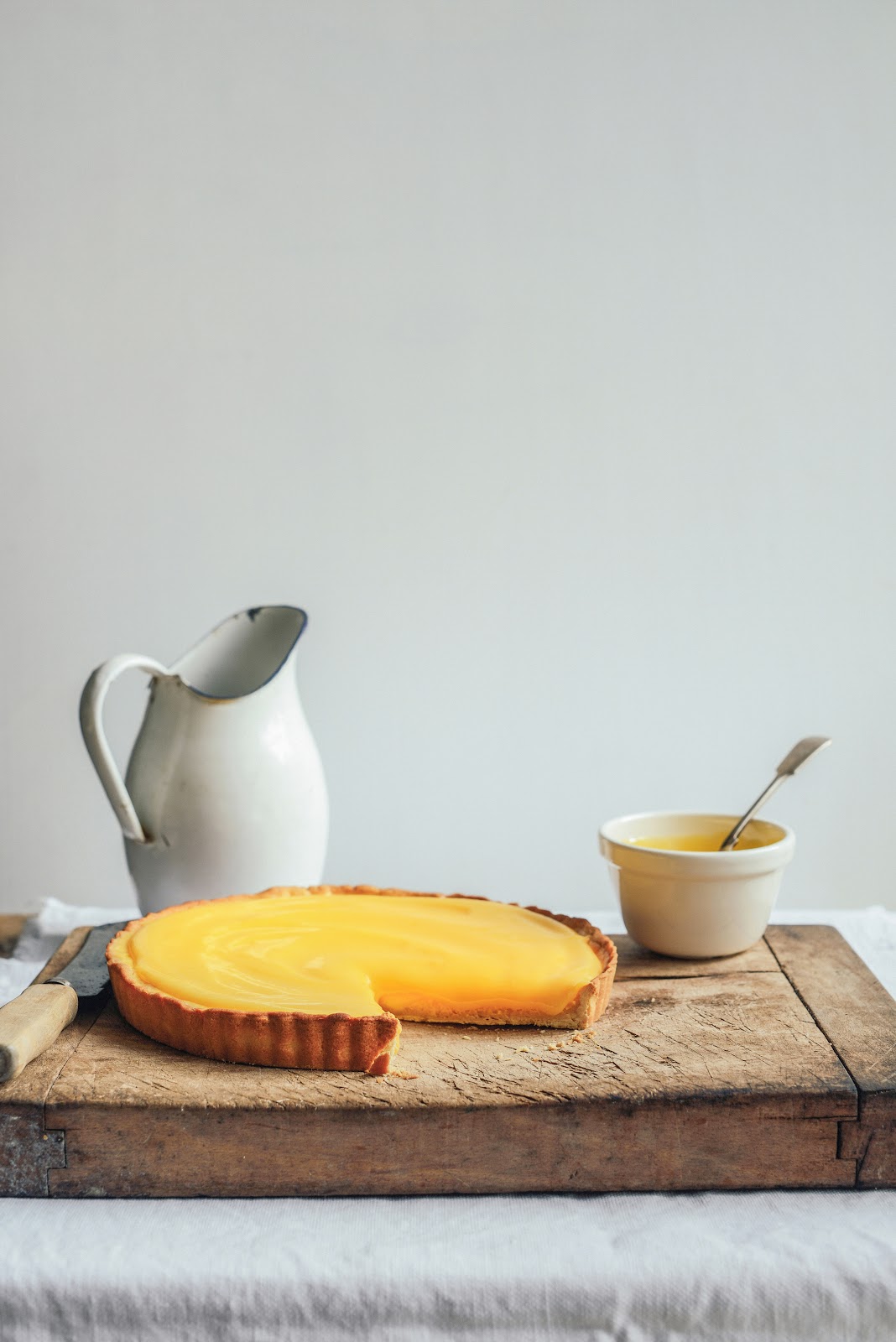 Now – do not skip this bit – it makes all the difference, gently prick the base of the pastry with a fork and cut out a circle of baking paper, a little larger than the tin. Line the pastry with baking paper and fill with baking beans or rice – it must come at least some way up the sides of the pastry, what you want is to pre-cook it so it doesn’t shrink or go soggy. Cook for 12Β minutes, carefully remove paper and beans/rice and cook a further 10 minutes until lightly golden. While this is cooking put cream cheese, custard powder, caster sugar and lemon zest into a food processor and blend until smooth. Add cream and lemon juice and pulse to combine then finally add eggs and yolks and blend for a just few more seconds until smooth.Once pastry is ready (baked ‘blind’) remove it from the oven, place on Β a baking tray and gently pour in the filling – by my calculations you should be just about spot on with the amount – you want it to come almost to the top. Reduce oven temperature to 150˚C (300˚F) then very gently pop tart back into the oven and cook a further 30 minutes until set but still with a bit of wobble in the middle. Turn the oven off, open the door wide and let itΒ sit there for half an hour Β before removing to cool on the bench, then in the fridge. The tartΒ can be made the day before or in the morning of the day you want to serve it. Remove from the fridge half an hour before serving. Slather about 3/4 cup of the lemon curd on top of the tart to serve. Serves 8-10